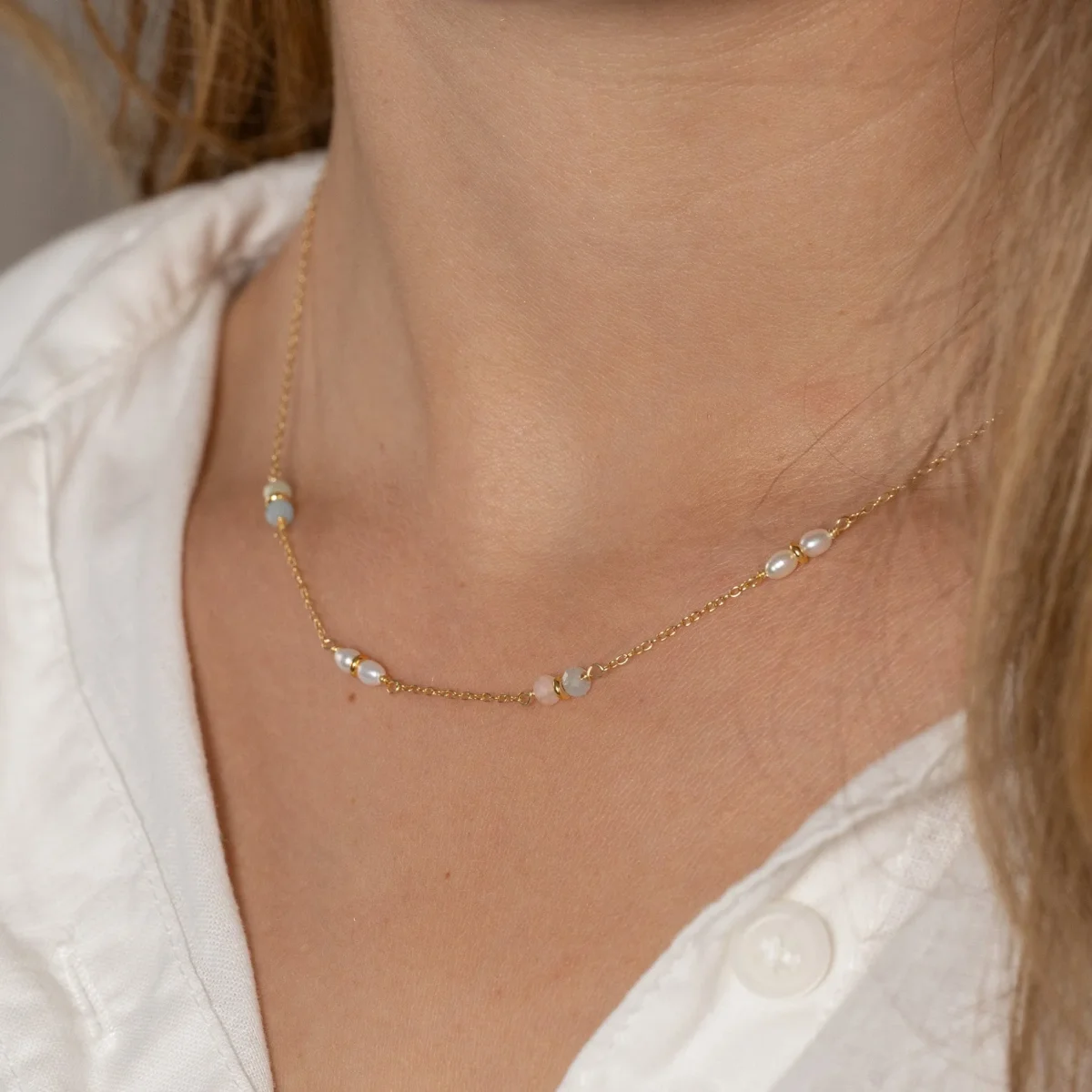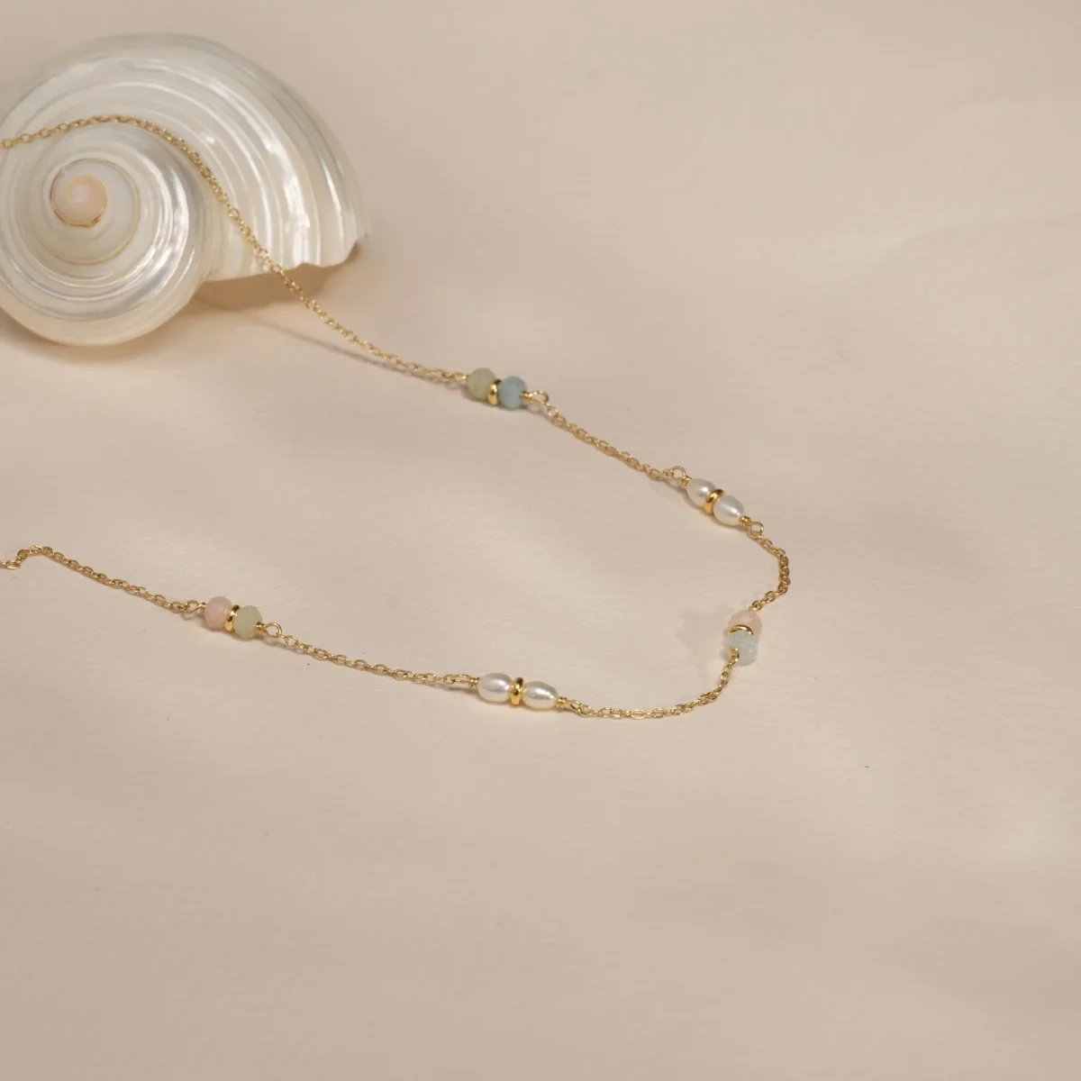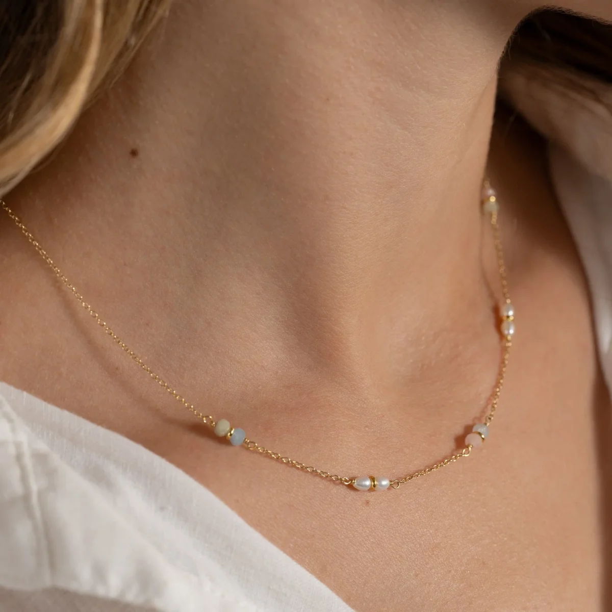 Halsbandet är tillverkat av 100% återvunnet 18 karat förgyllt sterlingsilver med små ovala vita sötvattenpärlor och morganitstenar i rosa, blå och gröna färger. Halsbandet är designat med växelvis ett par pärlor och ett par stenar separerade av kedjestycken.