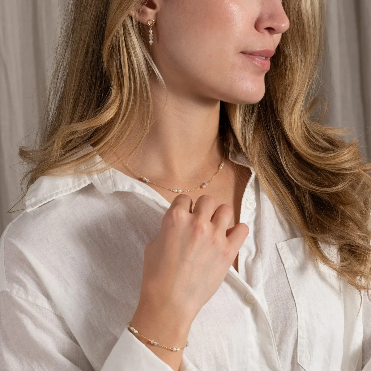 Du kan bära halsbandet ensamt eller tillsammans med andra halsband. Det finns också ett matchande armband och örhängen