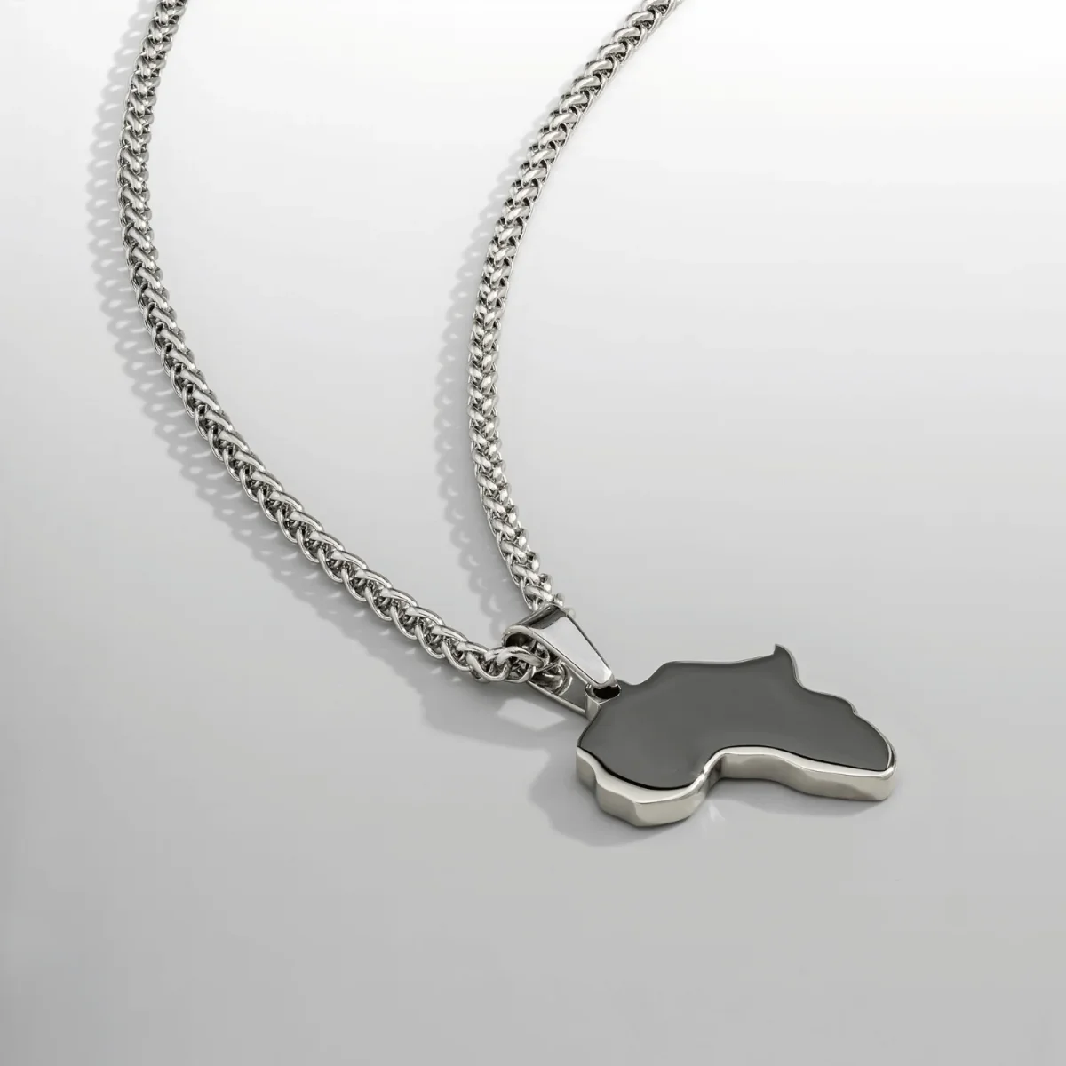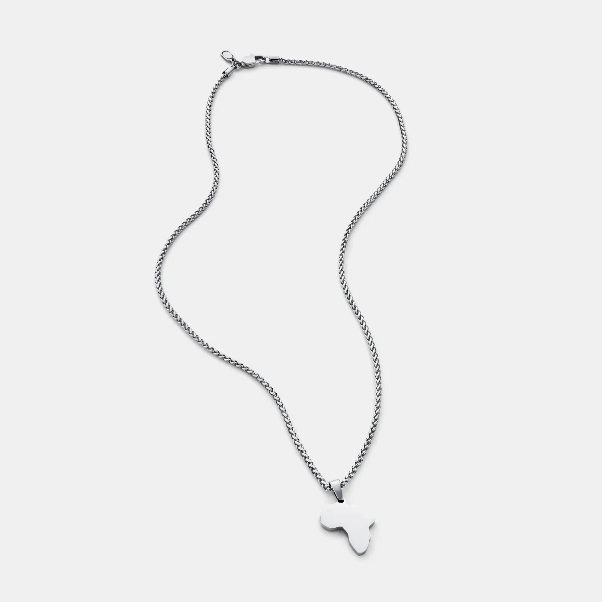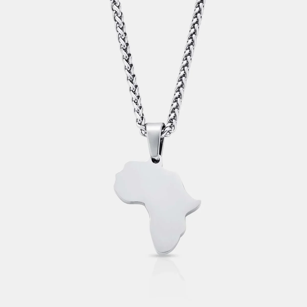 This silver necklace features a precisely hand-carved Africa pendant. It symbolises a deep pride in who you are and the strength of your heritage. Wear yours daily and honour your roots. It hangs proudly from a premium silver bail, a 3mm wheat chain, and is finished with scratch and fade-resistant protection.
