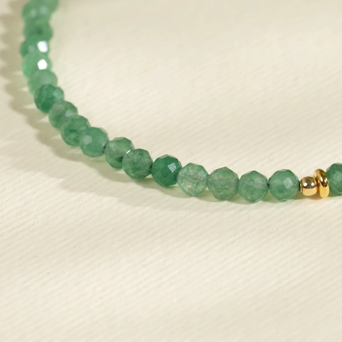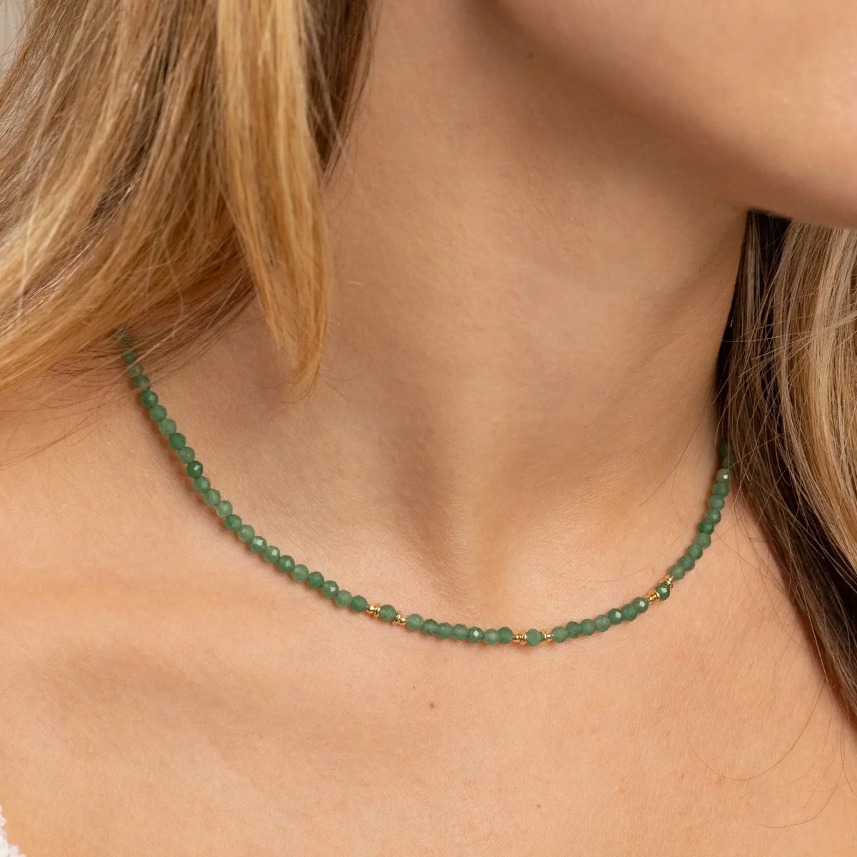 De fasettslipade aventurinstenarna ger ett levande ljusspel och ett elegant uttryck. Halsbandet kan bäras för sig själv eller kombineras med andra smycken för en mer personlig look. Perfekt för dig som önskar att bära ett smycke med en vacker grön färg och fina detaljer.