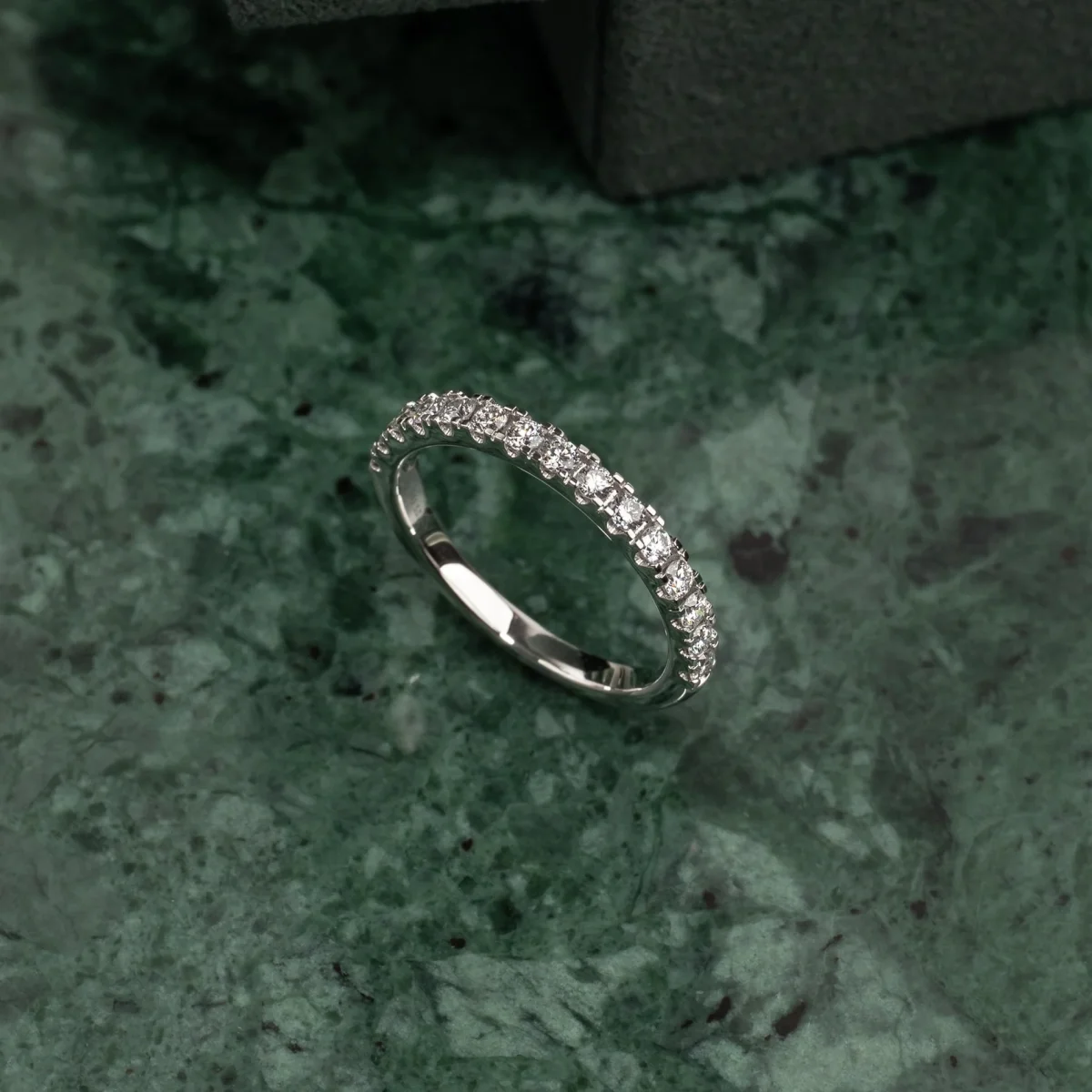 Alliansringen har en rad av labbodlade diamanter längs den övre halvan av ringskenan.