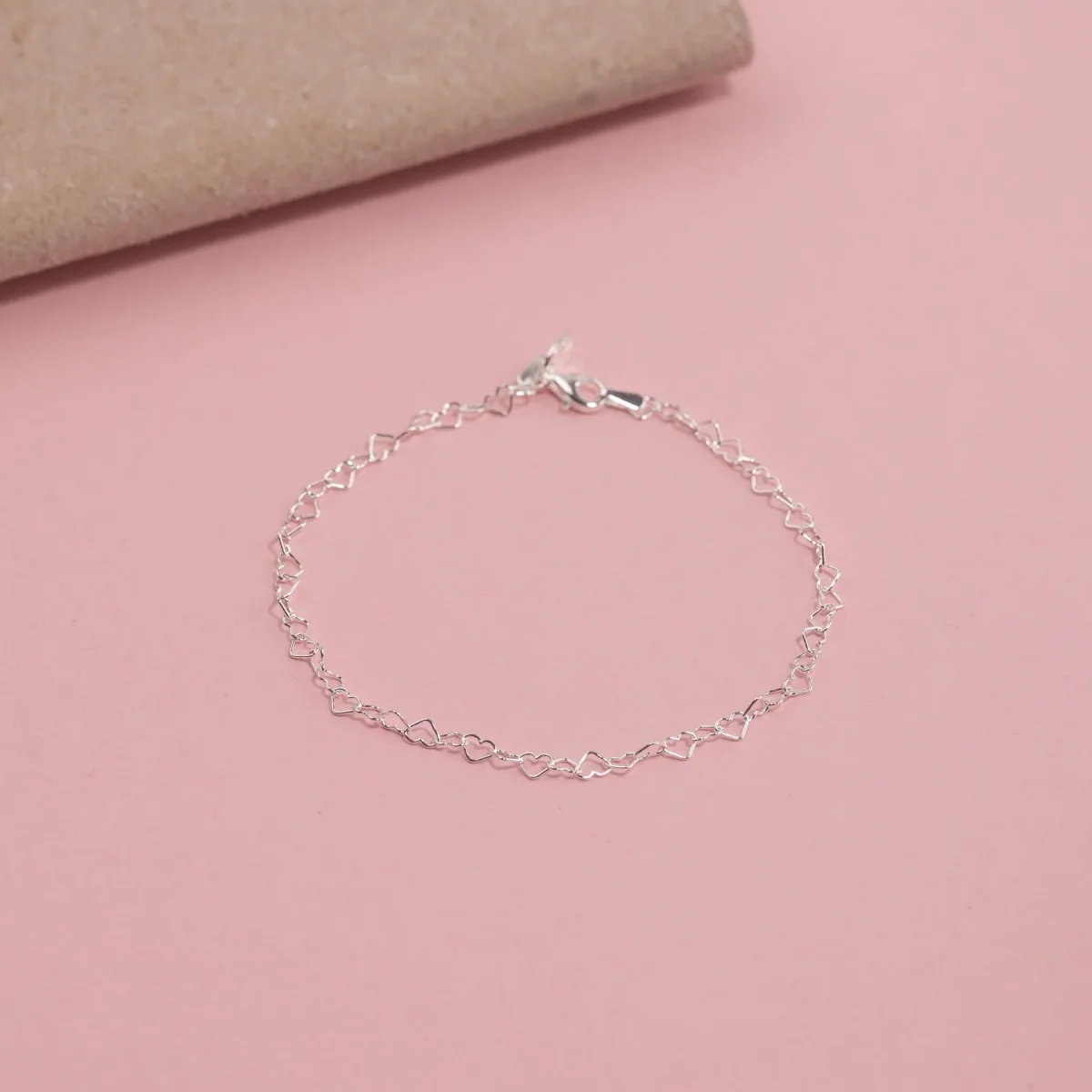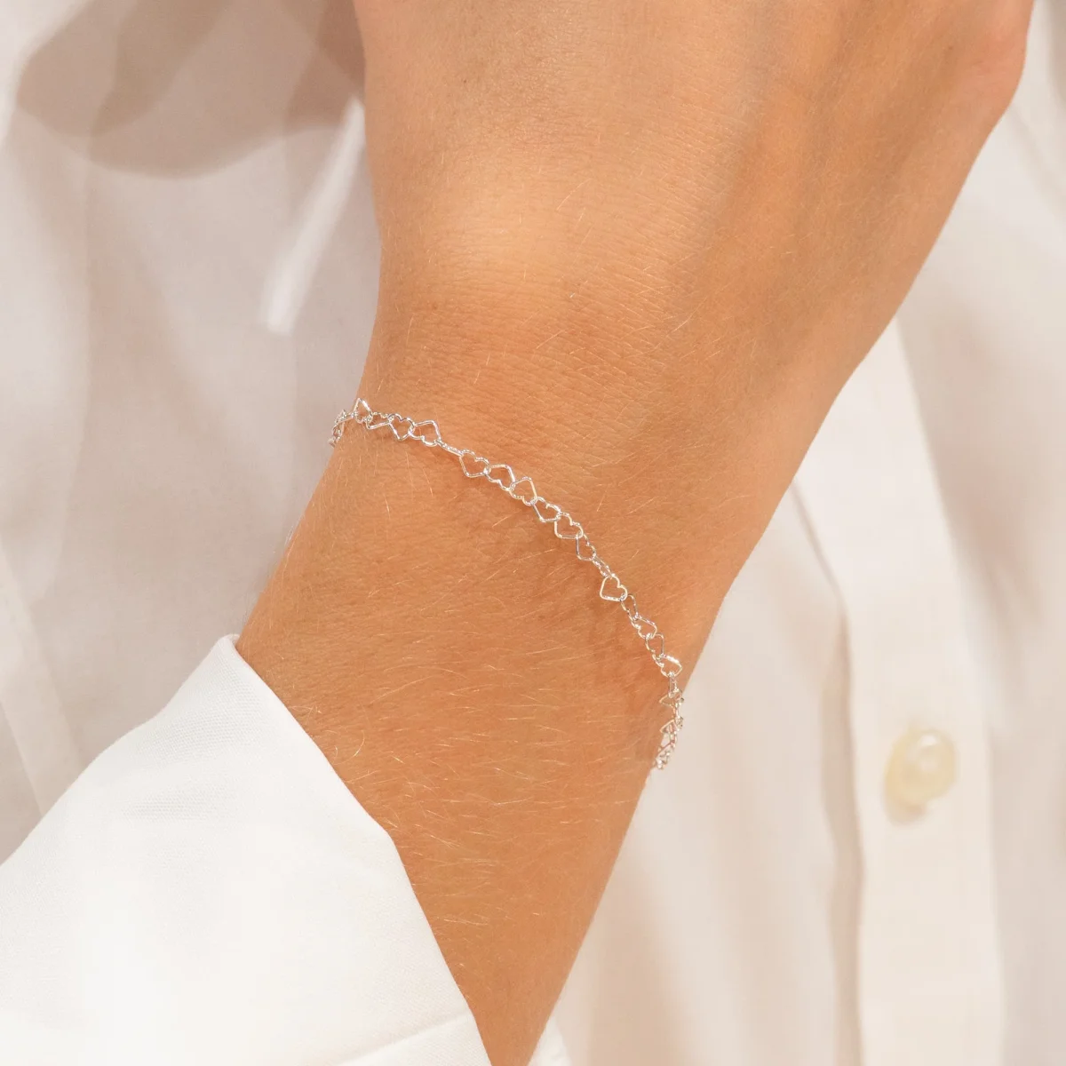 Armbandet är tillverkat i 100% återvunnet 925 sterlingsilver och består av länkar formade som små öppna hjärtan hela vägen runt handleden.
