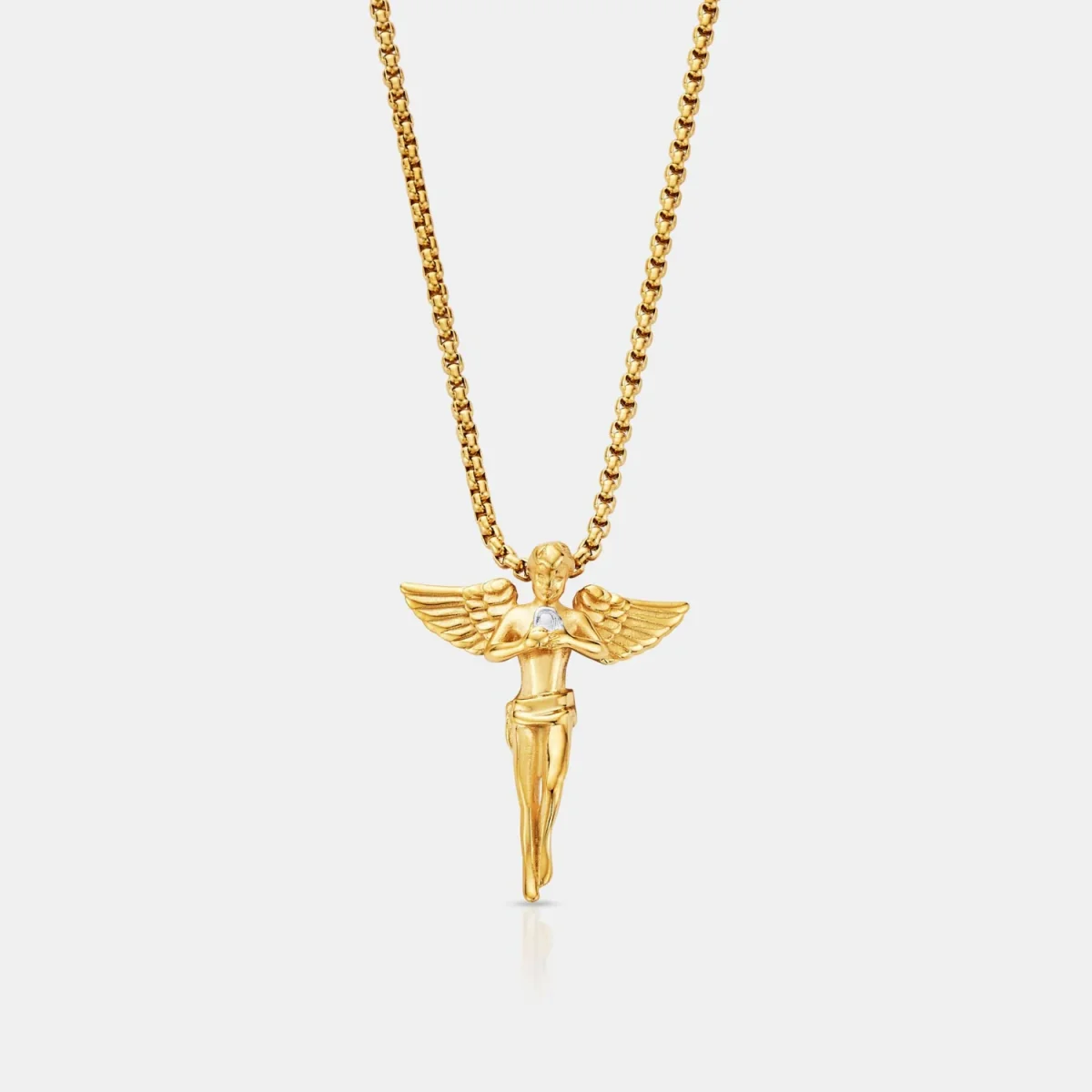 This 18K gold pendant features an intricately hand carved angel, representing strength, peace, and unwavering guidance. Wear it daily as a reminder that you’re never alone, and let her shield you from the challenges and temptations that cross your path. Suspended from a hidden golden bail and classic 2mm box chain, it’s finished with scratch and fade resistant protection.