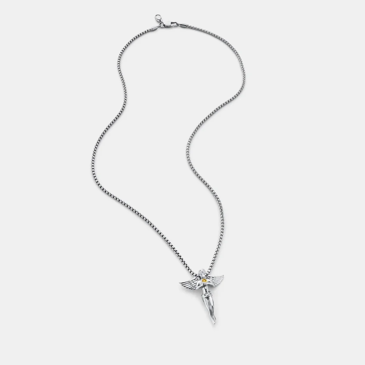 This silver pendant features an intricately hand carved angel, representing strength, peace, and unwavering guidance. Wear it daily as a reminder that you’re never alone, and let her shield you from the challenges and temptations that cross your path. Suspended from a hidden silver bail and classic 2mm box chain, it’s finished with scratch and fade resistant protection.