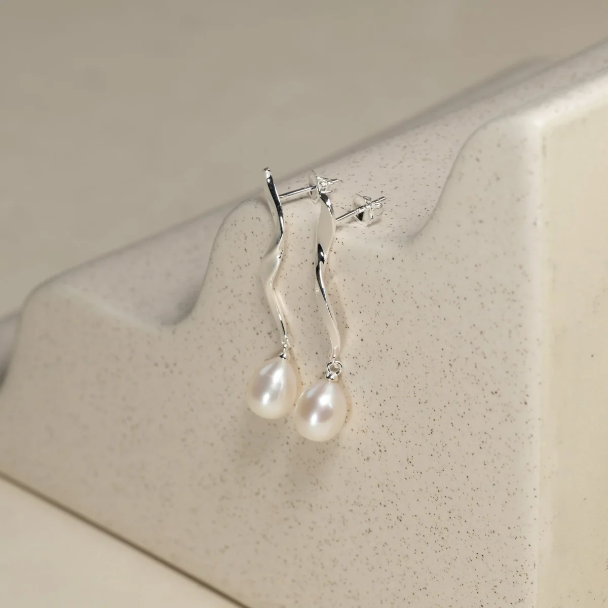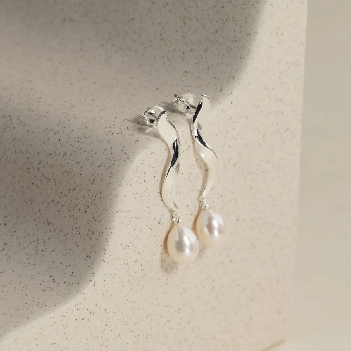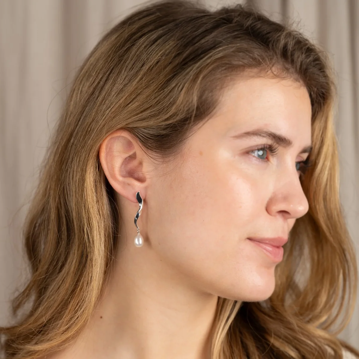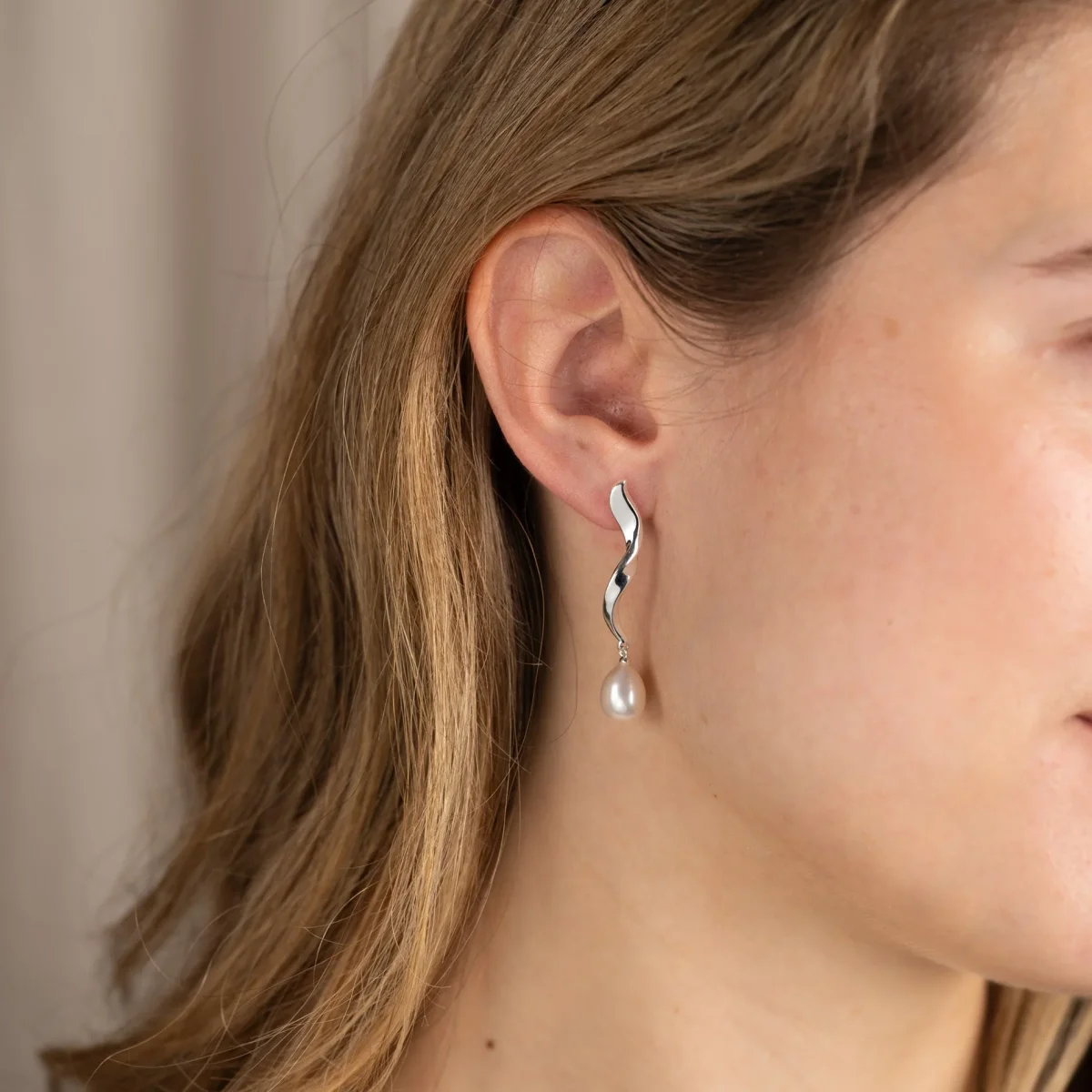 Örhängen i 100% återvunnet 925 sterlingsilver. Örhänget har en droppformad sötvattenpärla som är cirka 8 mm bred. Höjden på örhänget är 4 cm inklusive pärlan. Örhängena hänger vackert från örat och har en elegant vriden effekt framtill, vilket skapar ”rörelse” i uttrycket när du bär örhänget. Priset är för ett par.