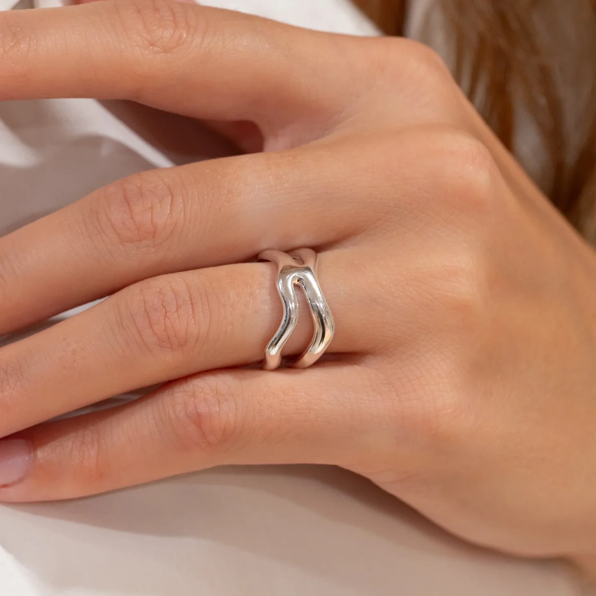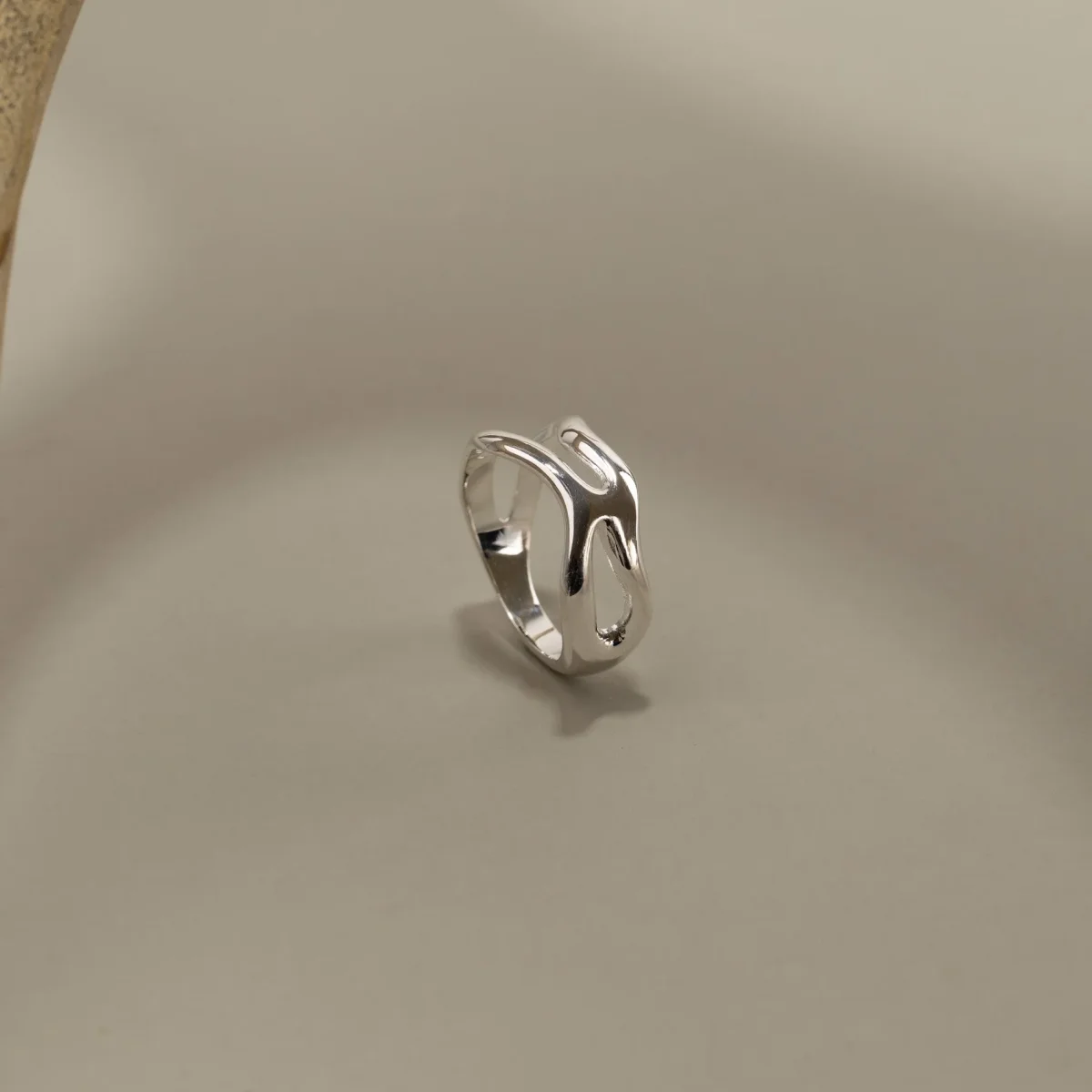 Ring i 100% återvunnet 925 sterlingsilver med en organisk design. De mjuka formerna ger ringen ett feminint och unikt uttryck som drar blickarna till sig. Bär den ensam som ett stilrent statement-smycke, eller kombinera med andra ringar för en mer personlig och sammansatt look.