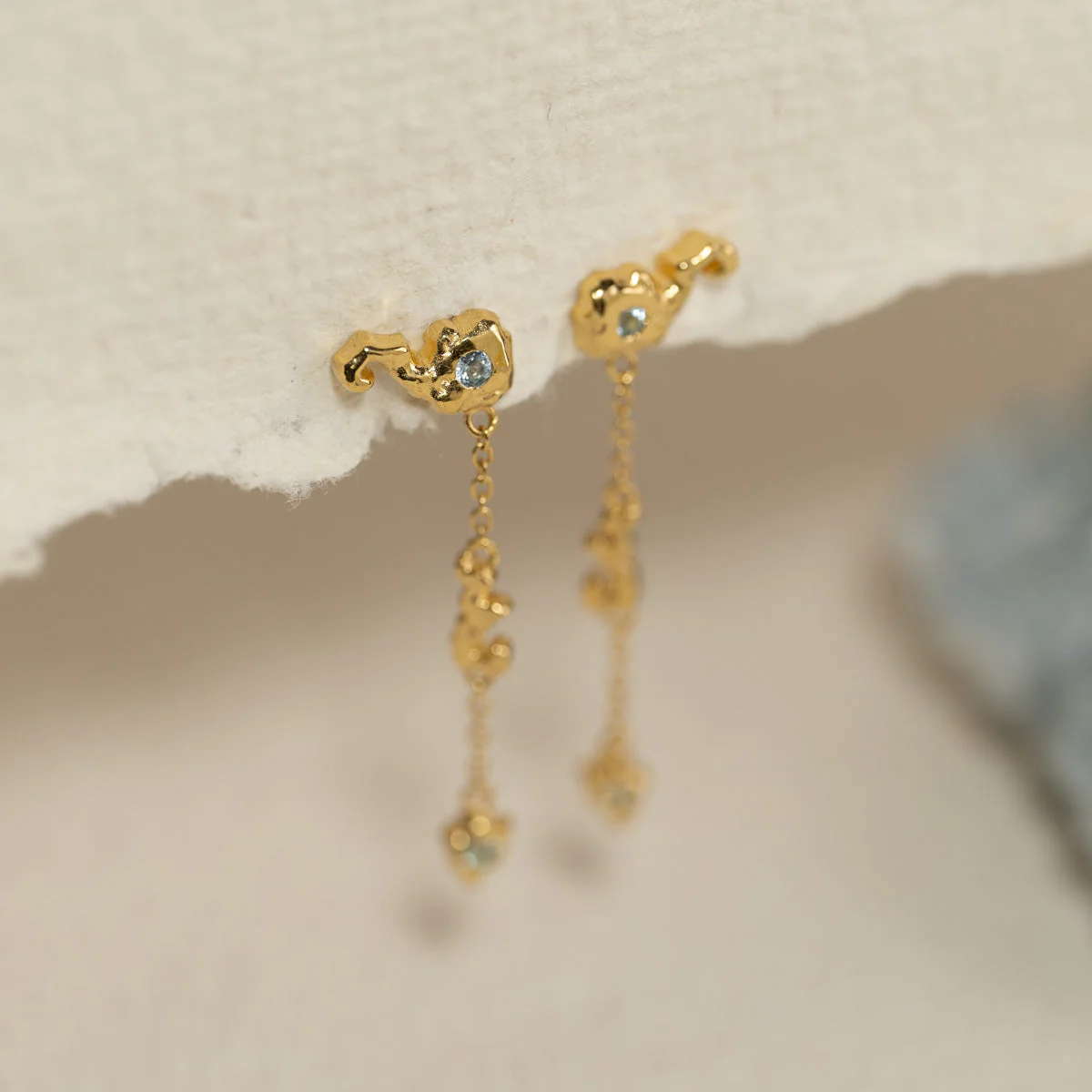 Aurelia-örhängena är skapade i 100% återvunnet 18 karats förgyllt sterlingsilver. Örhängena är designade som öronnitar med två hängande hängen i en kedja. Både öronniten och hängena har en organisk design med en ”moulded” yta. Varje örhänge har två blå topaser som ger örhängena en otroligt vacker detalj.