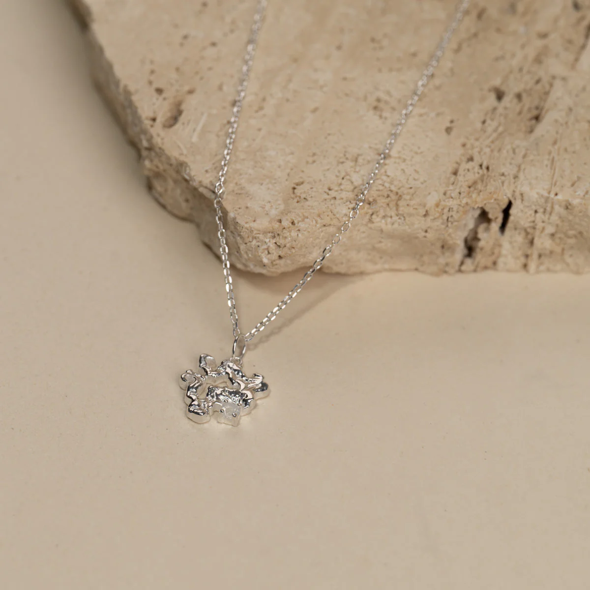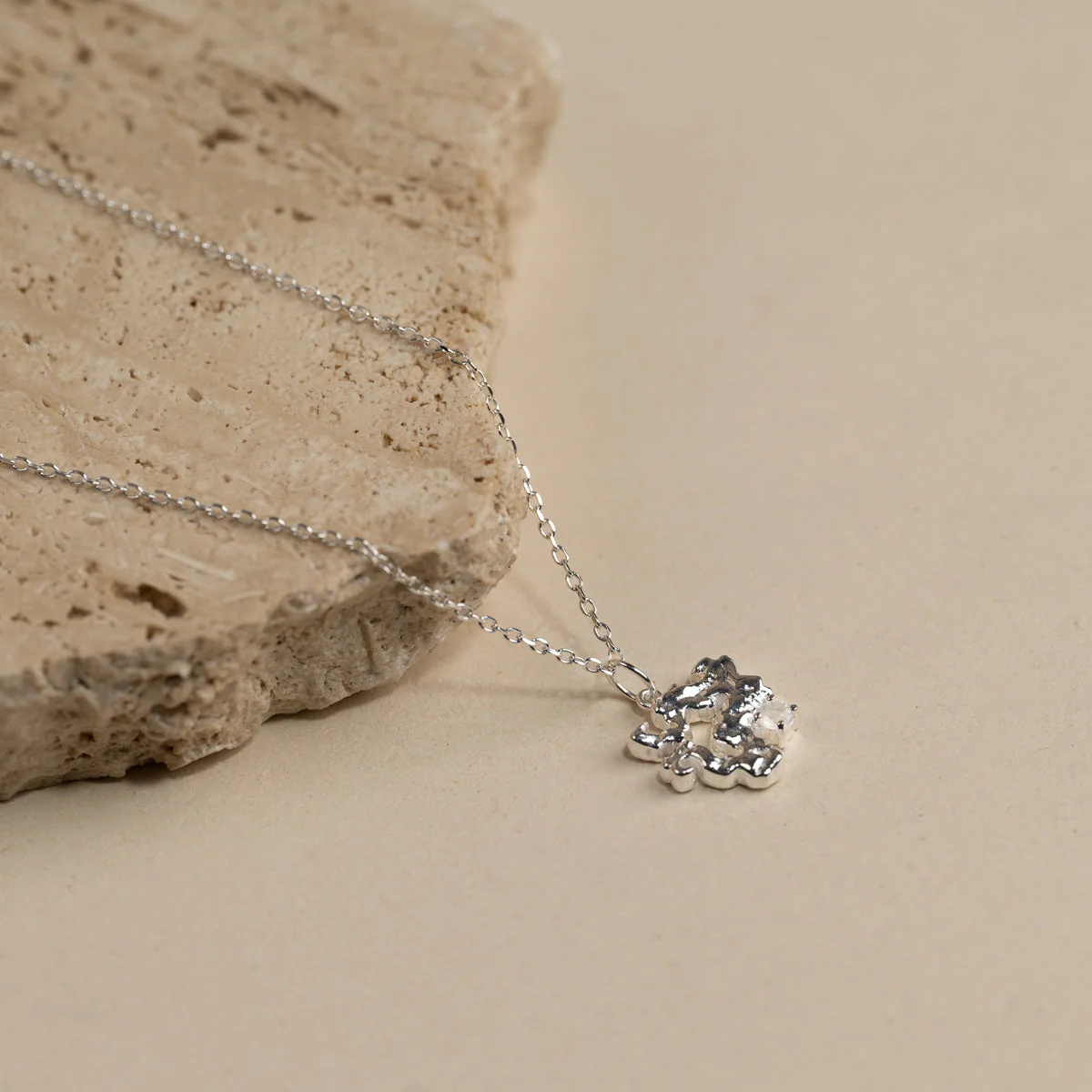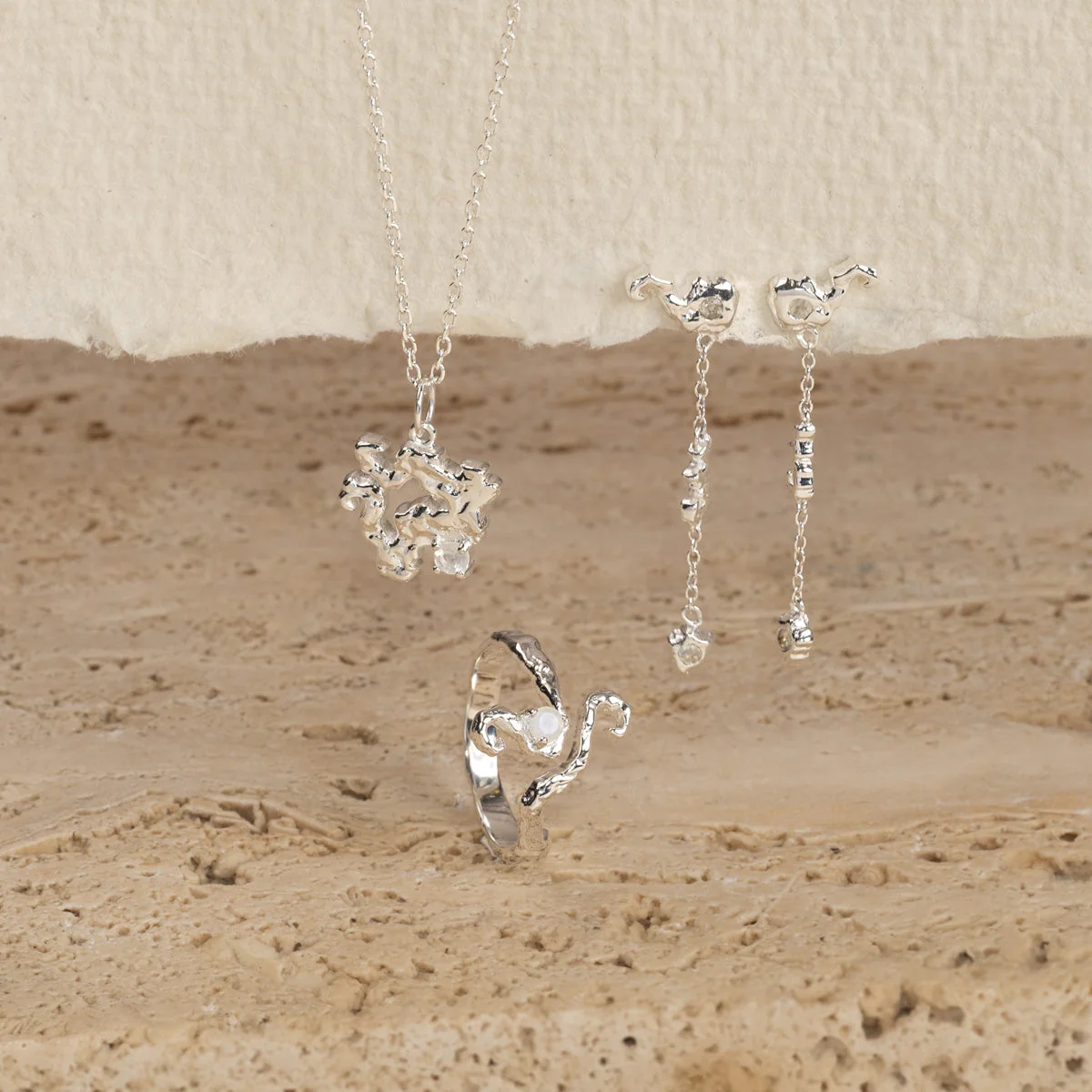 Hänget är skapat i 100% återvunnet 925 sterlingsilver. Det är designat med en månsten som har en vacker – ibland nästan mystisk – glans. Hänget har en organisk form som gör det unikt. Ytan på hänget är strukturerad och ger det en spännande och rå känsla.