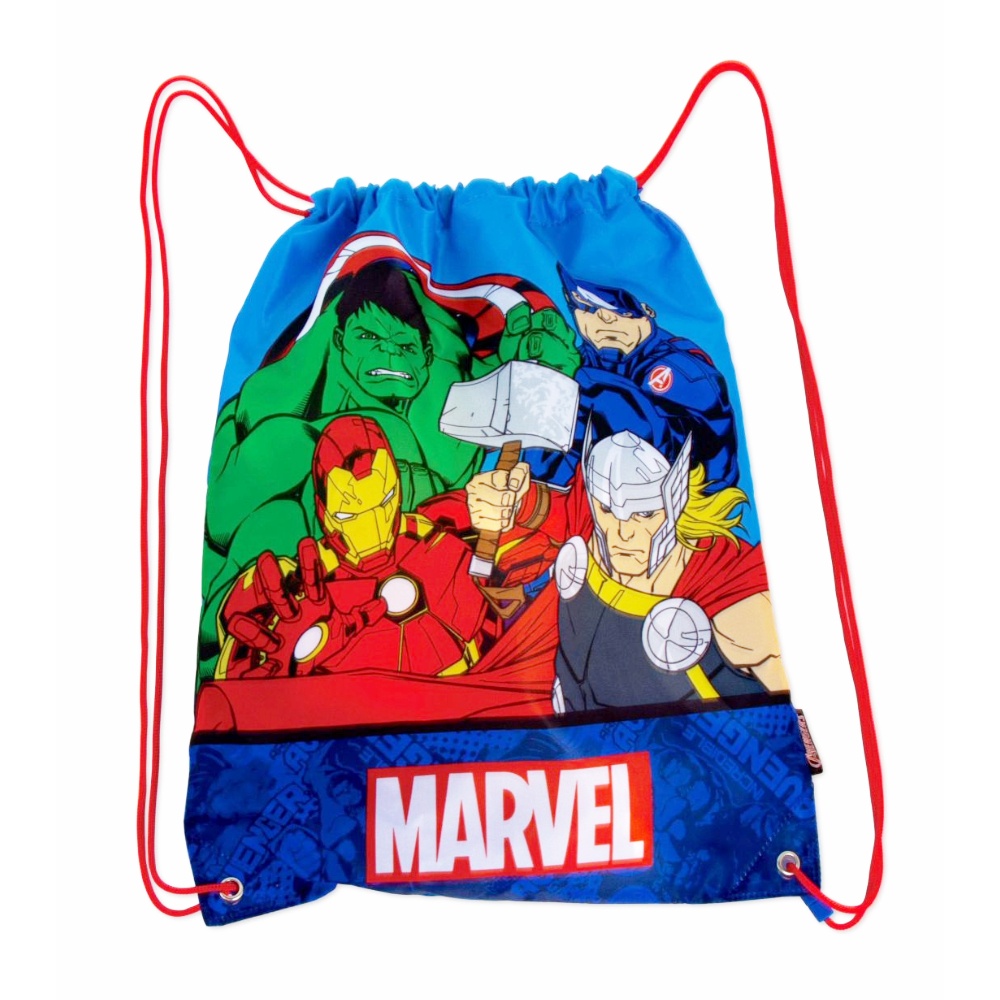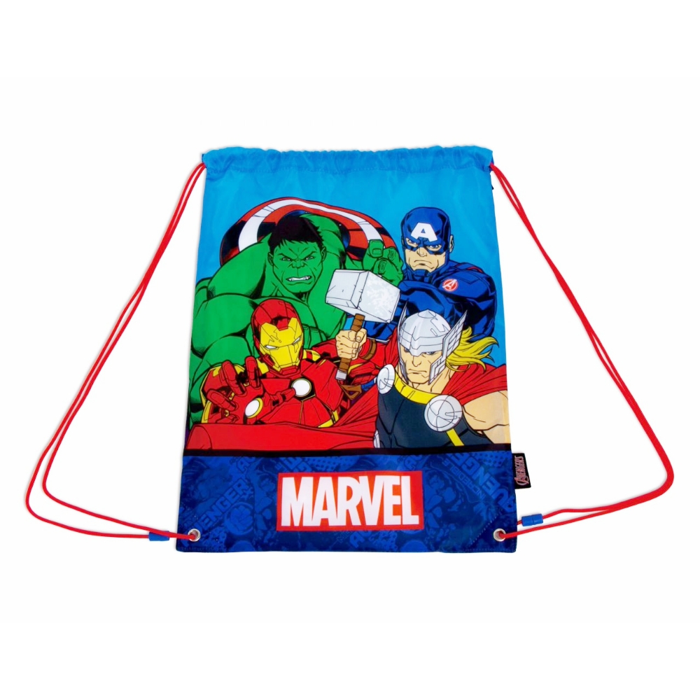 På framsidan finns Marvels Avengers-gäng med superhjältarna Iron Man, Captain America, The Hulk och Thor. Baksidan är blå.