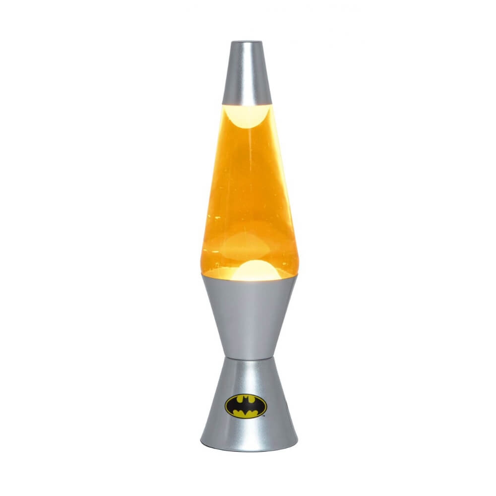 Silverfärgad lavalampa med Batman-logga på nederkanten av basen och gul/orange vätska.