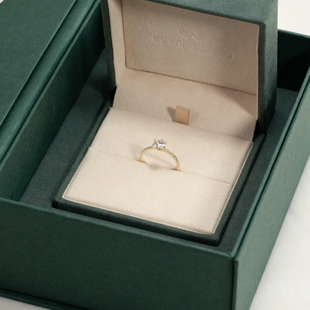 Ringen har en klassisk, elegant och feminin design som gör den perfekt som förlovningsring.