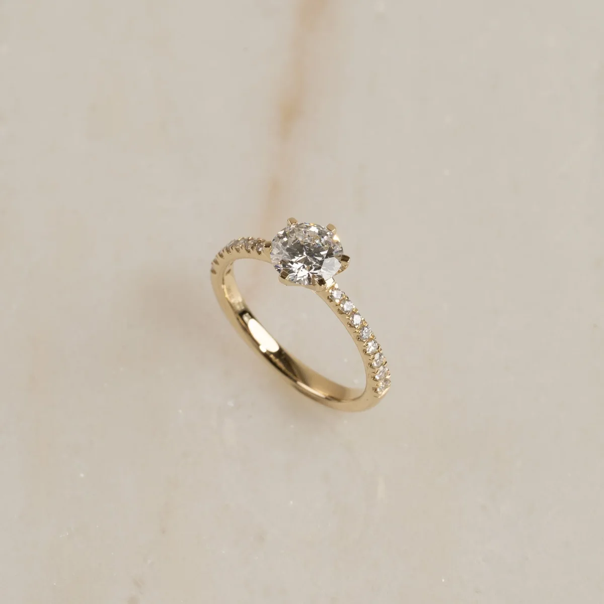Vacker ring i 14 karat massivt guld med labbodlade diamanter. Ringen har en mittsten på 1,0 ct., omsluten med 6 klor och dekorerad med diamanter längs ringskenan. Ringskenan är lätt avsmalnande, vilket innebär att den är bredare vid basen och smalare vid stenen- en elegant detalj som ger ringen ett lättare uttryck.