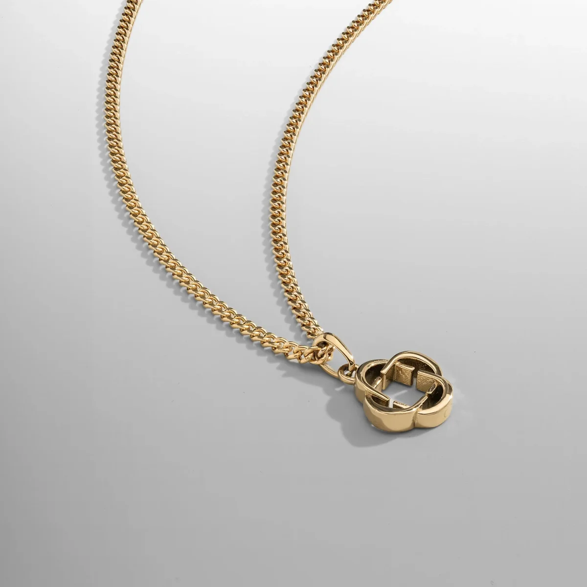 Suspended from a classic cuban link chain, this 18K gold necklace features a pendant of our iconic clover silhouette. Designed for daily wear, it hangs from a premium golden bail and is finished with scratch and fade-resistant protection. A timeless addition to any collection, perfect for wearing solo or layered with your other gold jewellery.