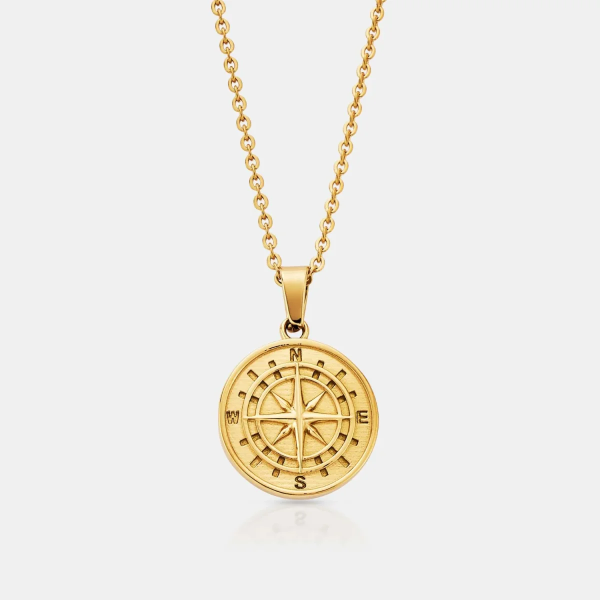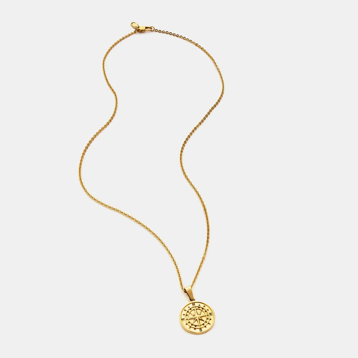 This 18K gold pendant features a finely detailed, hand carved compass medallion. Wear it daily as your reminder that a true leader never follows; he crafts his own path. Suspended from a 3mm link chain with a premium golden bail, it’s finished in our signature scratch and fade resistant protection.