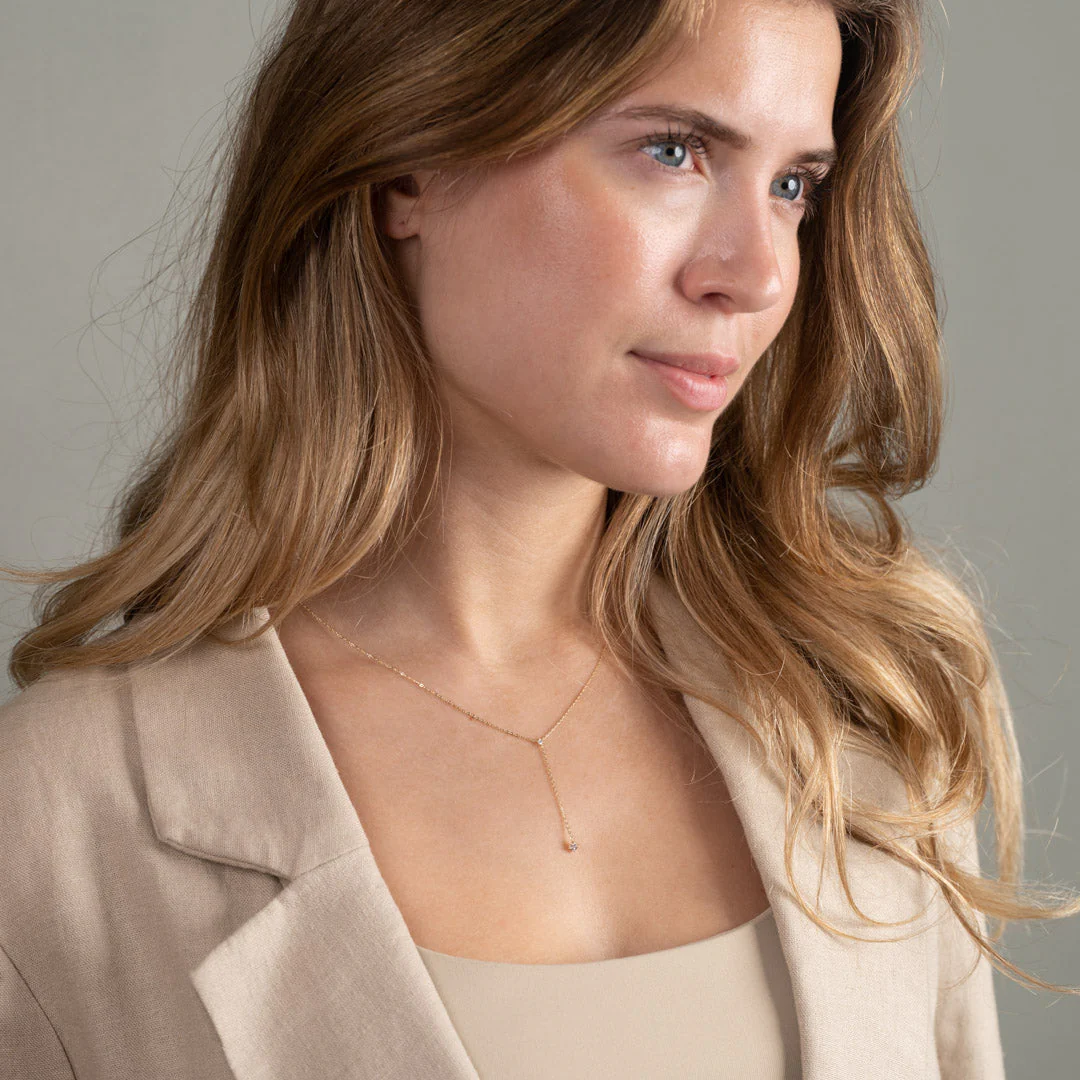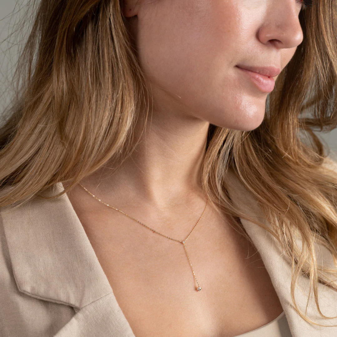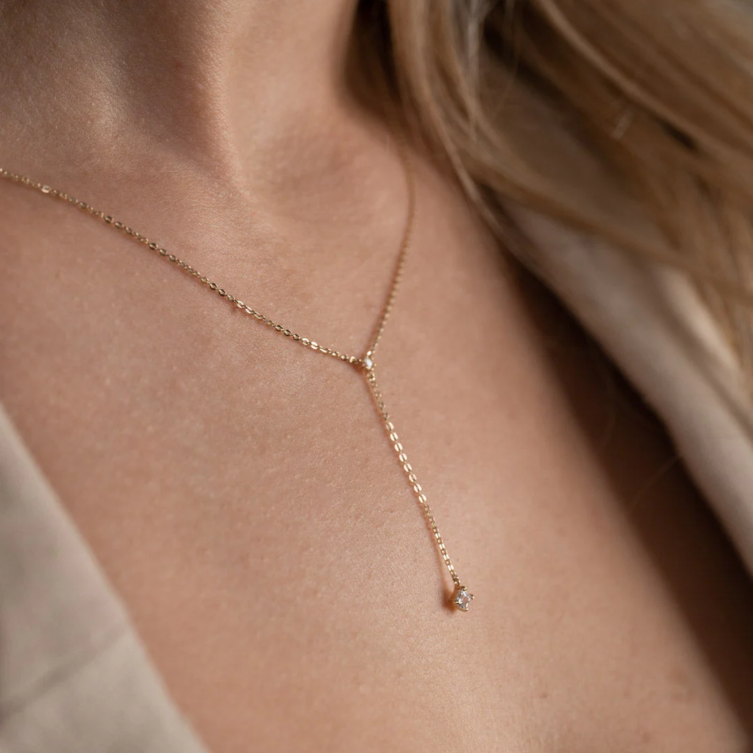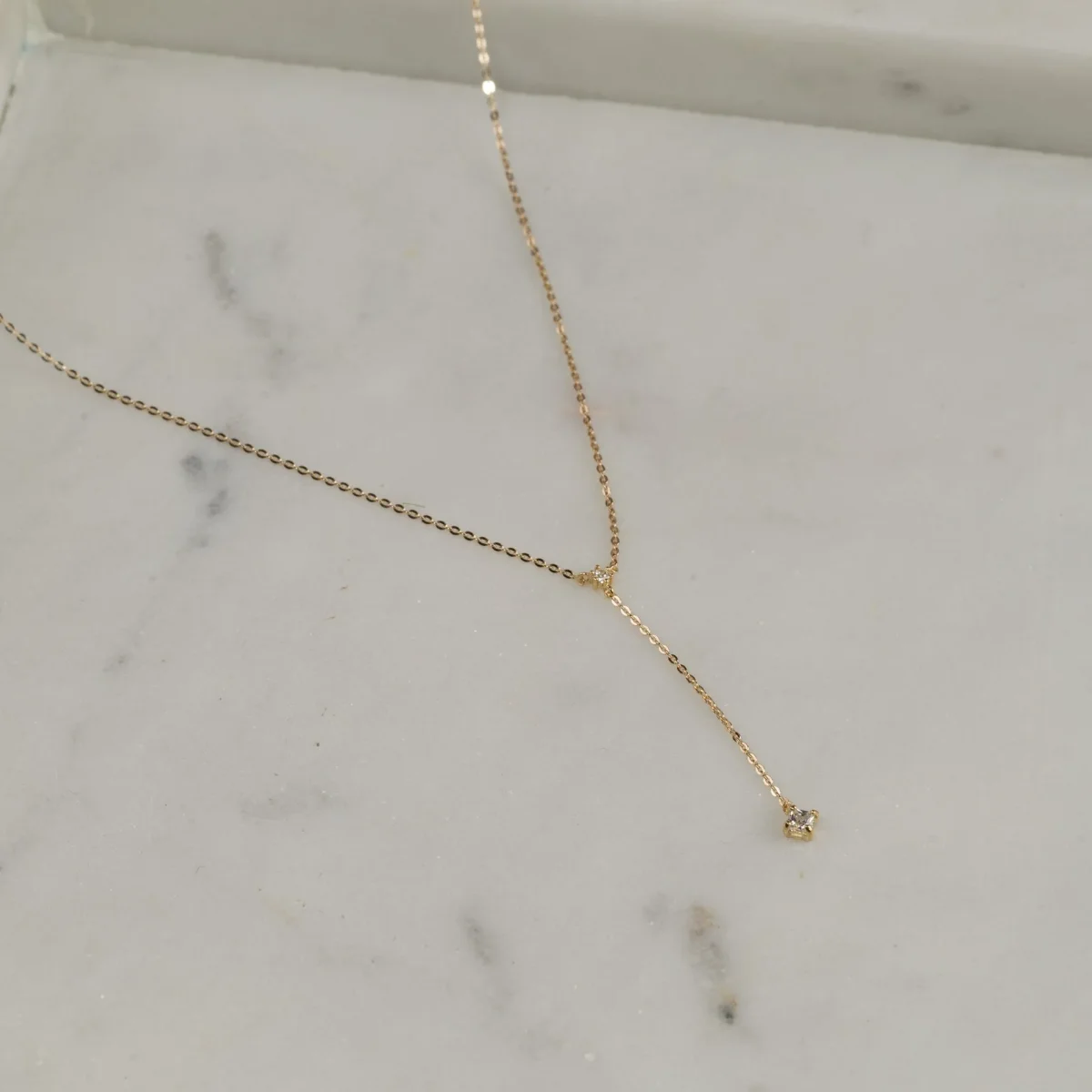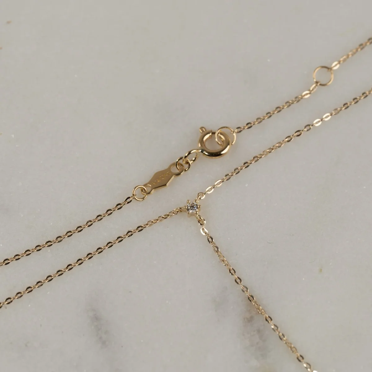 Vårt vackra Elenora -halsband är tillverkat av 100% återvunnet solid 9 karats guld med ett integrerat hänge med kubiska zirkoner. Halsbandet är utformat så att det finns en liten klar zirkon i mitten av kedjan från vilken en kedjebit faller ner från med en liten klar zirkon i slutet. Dropphänget är 40mm lång.