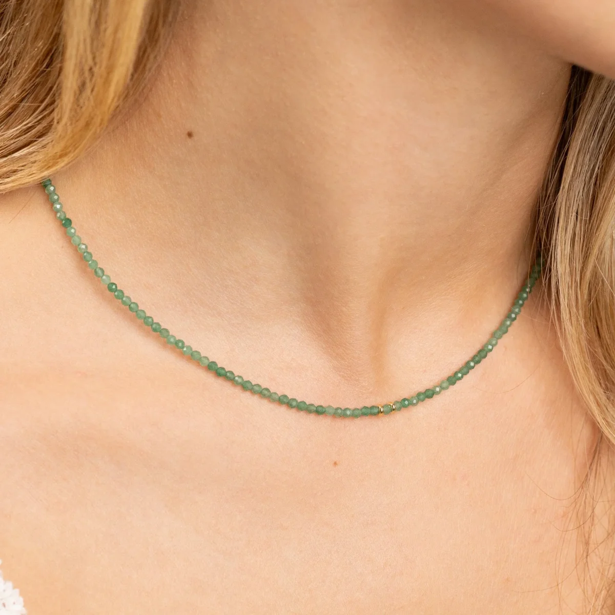 De fasettslipade aventurinstenarna skapar ett vackert spel i ljuset och ger ett elegant uttryck. Halsbandet kan bäras för sig självt för en stilren look eller kombineras med andra smycken för en mer personlig stil. Perfekt för dig som älskar smycken med naturliga färger och fina detaljer.