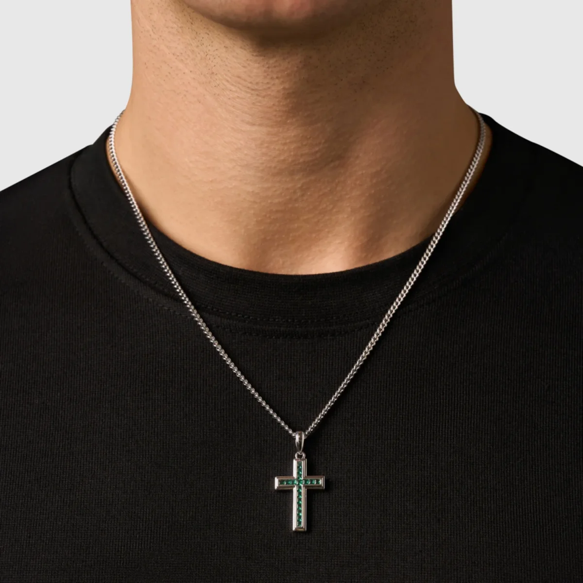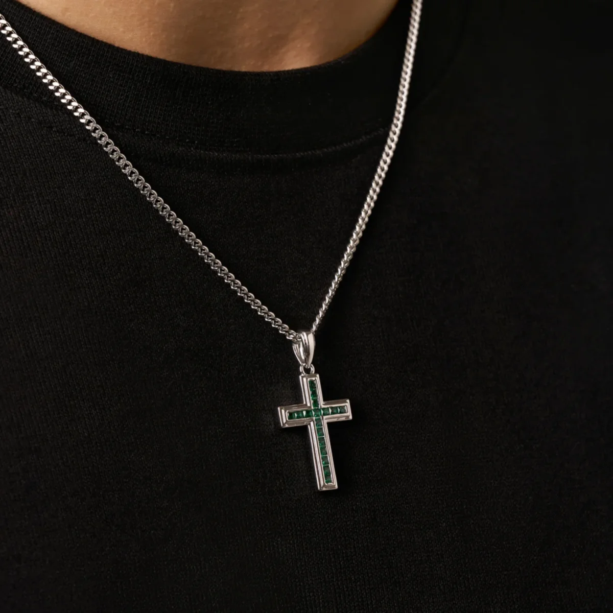 Said to shield its wearer from negative energies, this perfectly weighted cross is handset with rows of emerald-coloured stones, each framed inside silver bezels. An open backplate lets light pass through from behind, revealing the stones’ deepest, richest tones. Suspended from a Miami Cuban chain that rests naturally against your chest, this is a piece you put on once and never want to take off.