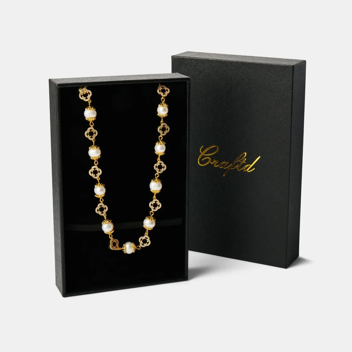 Hand-strung with the finest freshwater pearls, this necklace pairs natural texture with refined detail. Each pearl is framed by intricate 18K gold filigree caps, while our signature clover accents are set with 32 individually placed cubic zirconia stones. Finished with an adjustable lobster clasp and coupled links for a tailored fit, it’s designed to sit naturally along the neckline whether worn alone or paired with the matching necklace.
