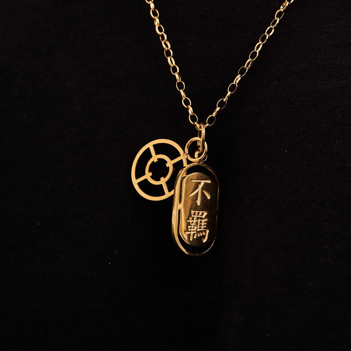 This 18K gold necklace features a finely detailed pendant combining the Chinese symbol for happiness with a bullseye. A reminder that the more you focus on what truly matters, the closer you get to hitting your mark. Every day is another shot. Make it count. It’s suspended from a premium golden bail, a 2mm link chain, and finished with scratch and fade-resistant protection.