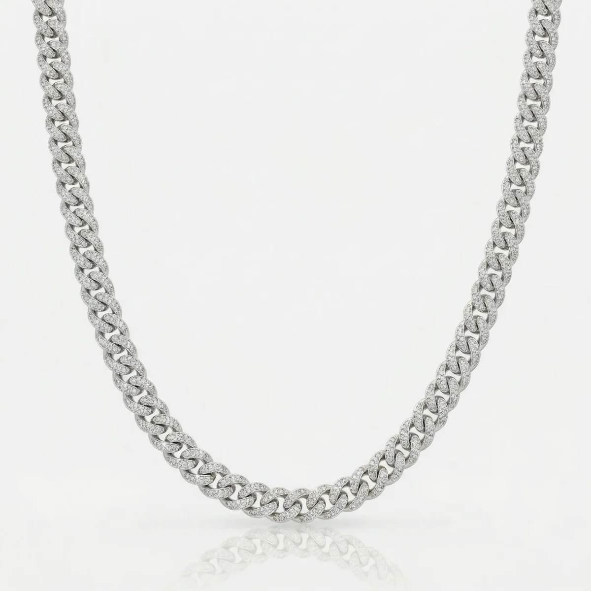 Handcrafted from solid interlocking links, this silver Cuban is handset with brilliant-cut stones that catch the light from every angle. Each stone is precision set directly into the links, creating a clean, fully iced finish across the chain. Designed to sit with presence along the neckline, it holds its own whether worn solo or layered with your favourite pieces. Finished with our signature snap-proof clasp and scratch-resistant protection, it’s CRAFTD to last a lifetime.