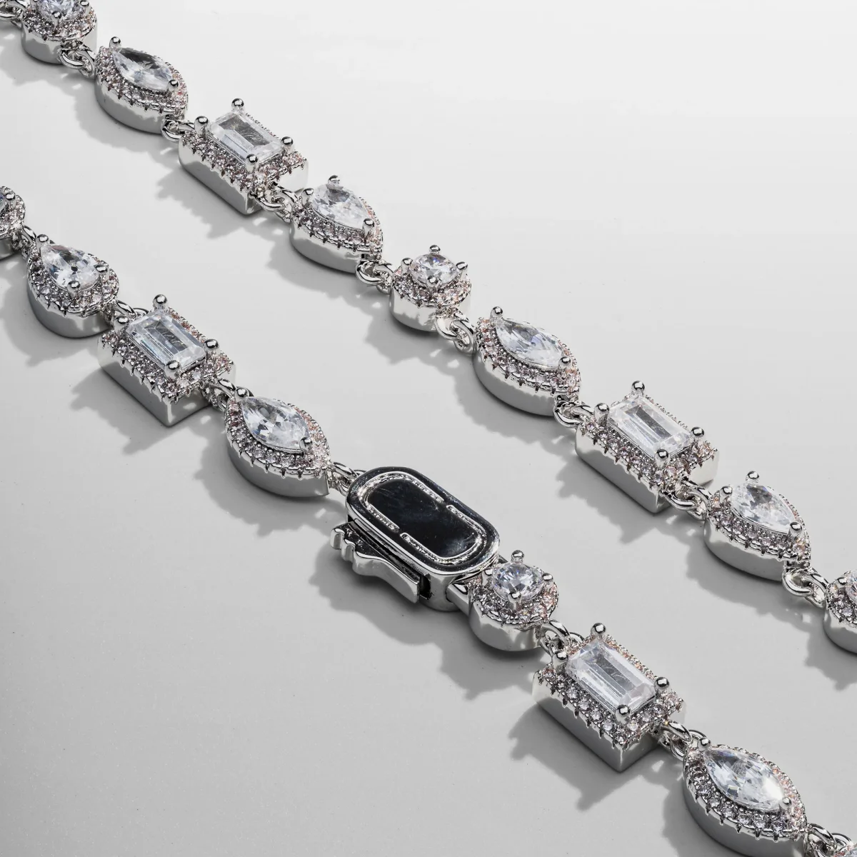 This necklace showcases alternating Oval, Teardrop, and Emerald-Cut Crystals, each framed within a 4-claw silver setting. Designed to reflect natural light, each crystal is encircled by a halo of the coldest AAA grade stones—handpicked and precision-set for a shine that rivals even the finest diamonds. The chain drapes effortlessly around the neckline, secured with a snap proof clasp and finished with scratch resistant protection.