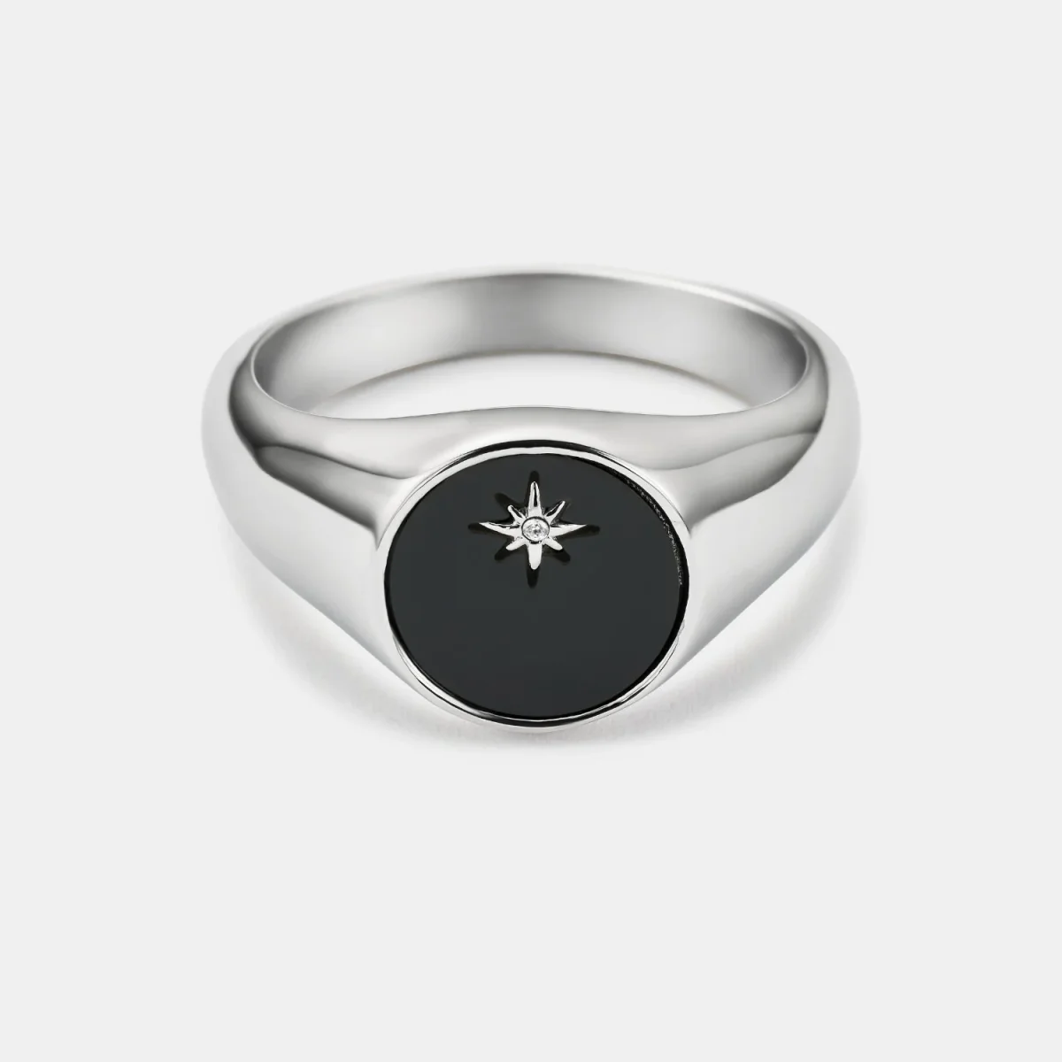 This signet features a silver Polaris, framed by a deep onyx inlay and finished with a single handset crystal. Inspired by the North Star, it represents guidance and direction, something to come back to when life starts pulling you away from what feels right. Along the shank, you’ll find the words intuition, guidance, mission, and belief. Quiet reminders to trust your gut, stay true to your values, and keep moving in your own direction. It sits on a smooth, polished band and is finished with our signature scratch and fade resistant protection.