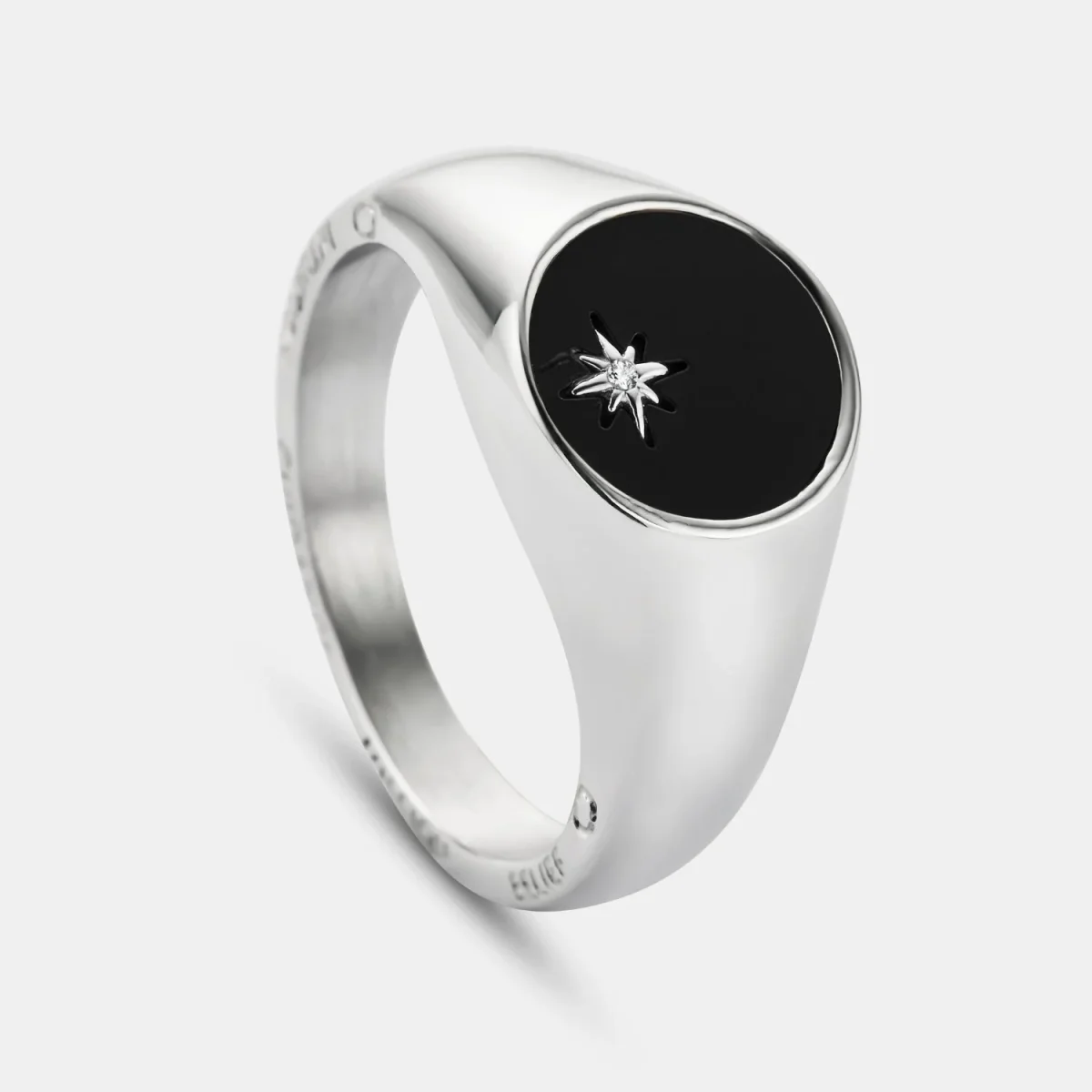 Your North Star, carried with you. This signet features a silver Polaris, framed by a deep onyx inlay and finished with a single handset crystal. Inspired by the North Star, it represents guidance and direction, something to come back to when life starts pulling you away from what feels right. Along the shank, you’ll find […]