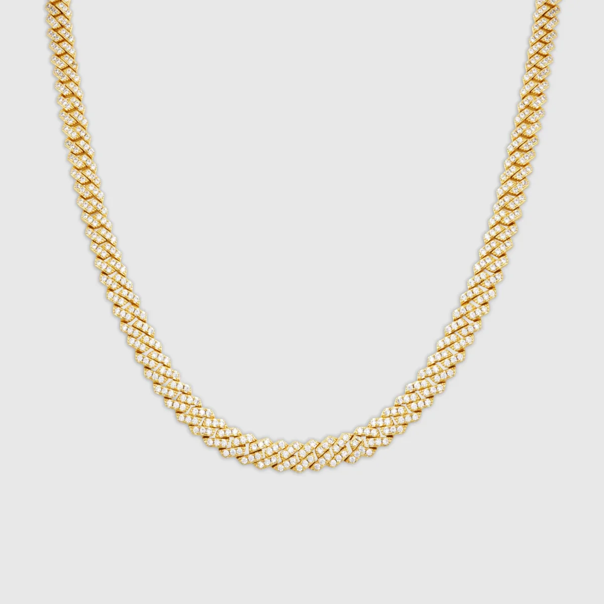 Handset with hundreds of the coldest AAA-grade stones, this prong link Cuban commands attention like nothing else. Its sharp, clean-cut links are designed to sit flat on your neckline with a shine that rivals even the finest diamonds. It features our iconic snap-proof clasp, scratch-resistant protection, and a premium 18ct gold finish.