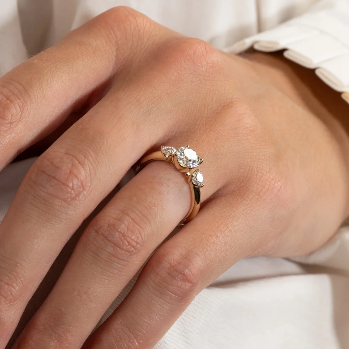 Ringen är tillverkad i 14 karat massivt guld med tre etiskt framställda labbodlade diamanter på totalt 1,40 ct. Diamanterna har färgen E/F och klarheten VVS. Smycket är skapat med omtanke; diamanterna är tillverkade med hjälp av bland annat solenergi, och guldet är 100% certifierat återvunnet.