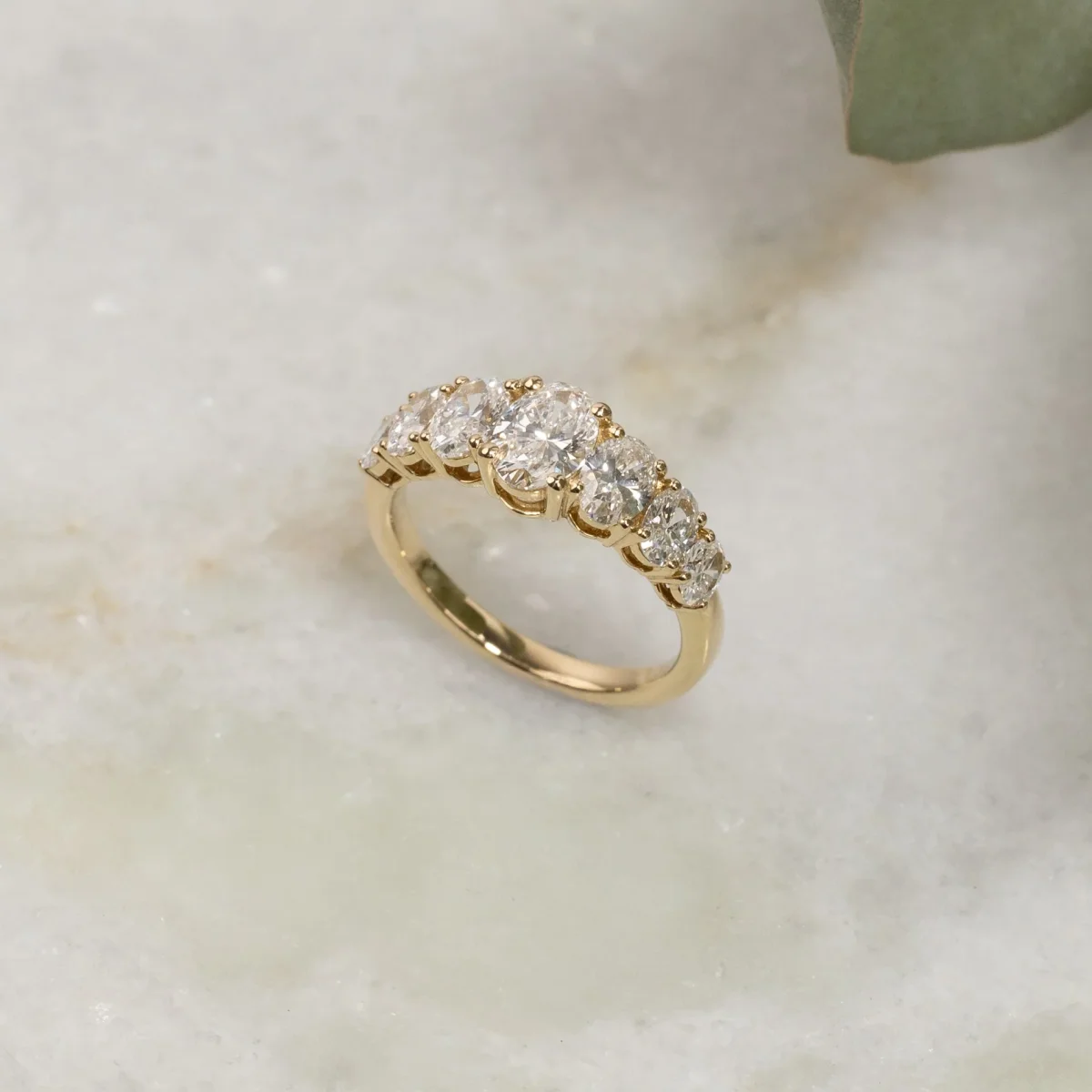 Denna eleganta ring är utsmyckad med 7 ovala labbodlade diamanter i graduerande storlekar, vilket skapar ett vackert och harmoniskt uttryck. Mittstenen flankeras av gradvis mindre diamanter som tillsammans täcker ovansidan av fingret.