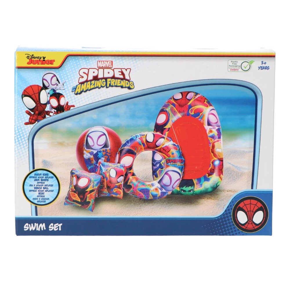 Det kompletta paketet för simturen! Du får ett set med matchande båt, badboll, badring och armringar (armpuffar/simpuffar) i Spiderman-tema.