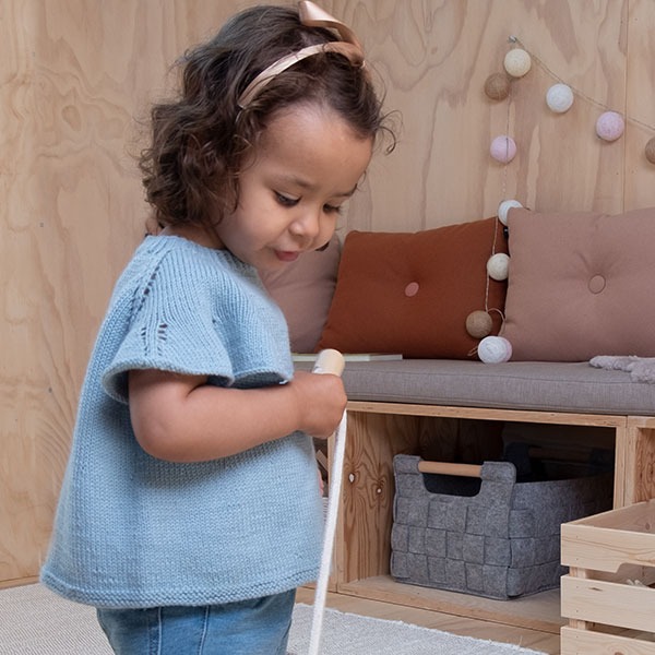 Den luftiga fjärilstoppen stickas uppifrån och ned. Toppen och fjärilsvingarna är enkla att sticka. Toppen passar bra till danskjolen i samma kollektion. Toppen på bilden är stickad i färgen Dus gråblå, men garnförpackningen finns i många fler färger. Garnsorten är Bluum Pure Eco Baby Wool (100% ekologisk ull). Se även samma topp i lyxgarnet Solo Cashmere. Stickas på stickor 2,5 och 3. Behöver du stickor? Kom ihåg att beställa i tillägg.