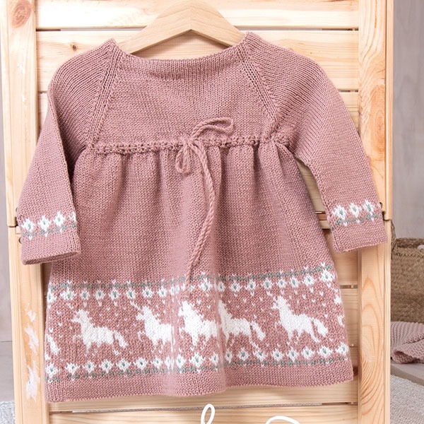 Stickad klänning Enhörning – garnpaket i Bluum Pure Eco Baby Wool