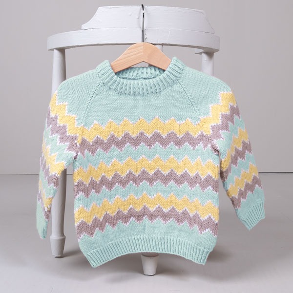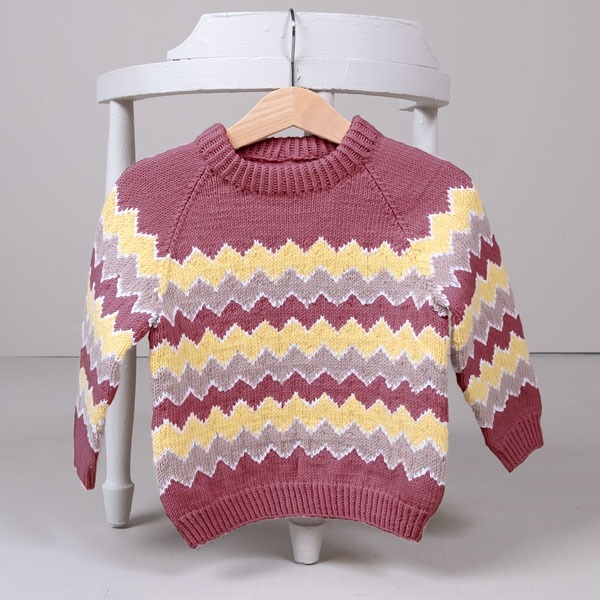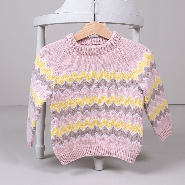 Lollipop, tröja! En trendig tröja med sicksack mönster. Ett helt nytt plagg i serien sockervadd med varma och mjuka plagg i ljusa vår- och sommarfärger. Garnpaketet innehåller mönster och allt garn du behöver för att sticka tröjan. Garnsorten är Bluum Soft Merino Ull, 100% extra fin och naturlig merinoull. Modellen på bilden är stickad i färgerna Rosa, Sand och Ljusgul med tunna vita ränder. Den finns också i andra färger, där den rosa byts ut. Designen är exklusivt för Bluum. Stickas på stickor 2,5 och 3. Behöver du stickor? Kom ihåg att beställa i tillägg. Se allt i Ränder-mönster här! Vill du ha ett par byxor som passar? Kolla in det här.