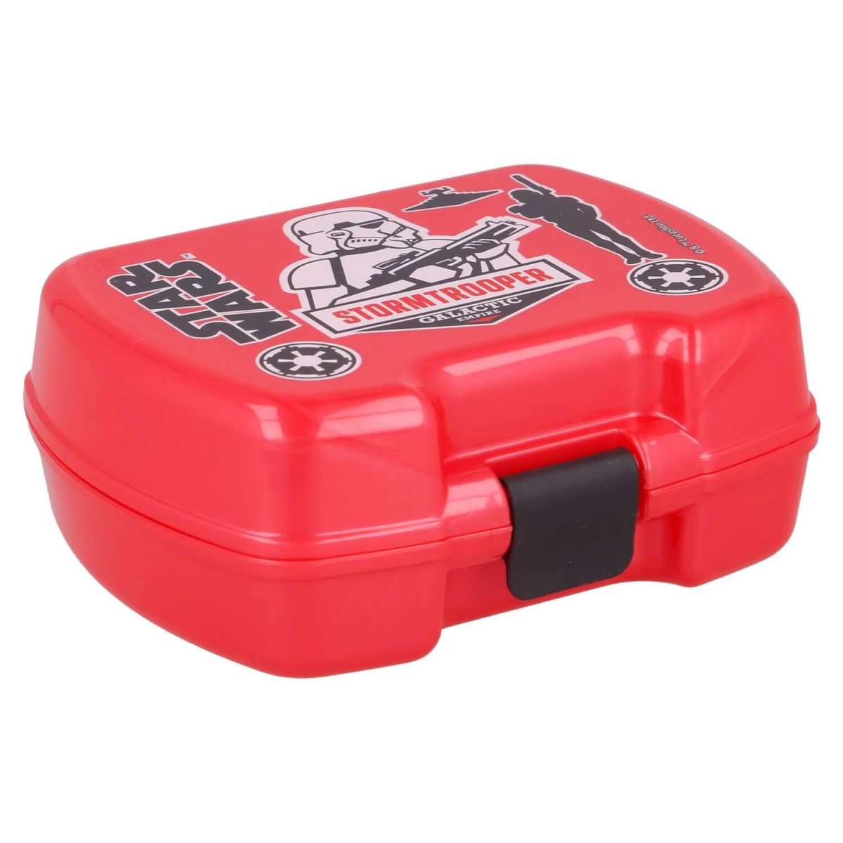 Liten snackslåda som rymmer nötter, godis eller annat smått, Lådan är röd med tema från Star Wars.